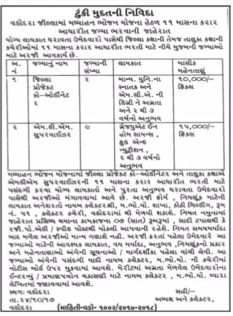 : Collector Office Mid Day Meal (MDM) Scheme, Kheda has announced an Official Employment Notification to recruit District Project Coordinator Posts .more detailed information regarding educational qualification,age limit,selection procedure,how to apply ,last date for MDM Kheda Recruitment 2017 are mentioned below.MDM VADODARA JOBS 2017MDM Kheda Recruitment 2017 for District Project Coordinator & Supervisor PostsName of Organization:Mid Day Meal (MDM) Project , VadodaraTotal No.of Posts: 11Name of the Posts:1. District Project Coordinator : 01 PostQualification: GraduateSalary: Rs.10,000/-2. Supervisor : 08 PostsQualification: GraduateSalary: Rs.15,000/-Age Limit: 18 to 33 yearsSelection Process: Candidate will be selected based on interview.How to Apply MDM Kheda Vacancy ?Interested & eligible candidate can sendtheir application at the following address on or before 07 Days of Published Advt.Send your application to given address:Dy.Collector,Mid Day Meal (MDM) Scheme Office,Collector Office, Kothi Building, Room No.51 , VadodaraImportant Date:Last date for receipt of application : 07Days of Published Advt. (Advt.PublishedDate 24-10-2017)